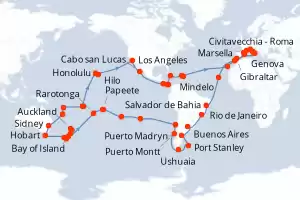 Itinerario : Civitavecchia - Roma, Genova, Marsella, Barcelona, Gibraltar, Casablanca, Mindelo, Salvador de Bahia, Rio de Janeiro, Buenos Aires, Puerto Madryn, Puerto Argentino, Ushuaia, Puerto Montt, Valparaíso, Isla de Pascua, Pitcairn, Papeete, Moorea, Aitutaki, Rarotonga, Bay of Island, Auckland, Tauranga, Christchurch, Dunedin, Milford sound, Hobart, Sidney, Nouméa, Luganville, Pago Pago, Apia, Honolulu, Hilo, Los Angeles, Cabo san Lucas, Puntarenas, Canal de Panama, Canal panama (Enter), Ocho Rios, Road Town, Philipsburg, Las Palmas, Palma de Mallorca, Nápoles, Civitavecchia - Roma