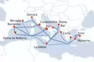 Itinerario : Civitavecchia - Roma, Barcelona, Salerno, Marsella, Mykonos, Genova, Izmir, Mykonos, Izmir, El Pireo Atenas, Corfú, Bar, La Valetta, Bari, Palma de Mallorca, Nápoles, Barcelona, Palma de Mallorca, Barcelona, Civitavecchia - Roma