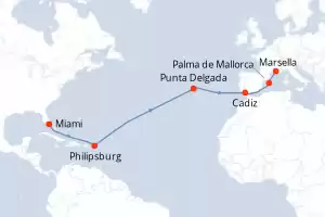 Itinerario : Miami, Philipsburg, Punta Delgada, Cadiz, Palma de Mallorca, Marsella